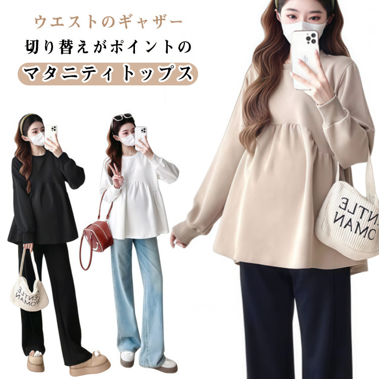 産後 マタニティ 長袖 マタニティウェア マタニティ服 体型カバー カットソー トレーナー レディース 秋冬 産前 クルーネック ギャザー切替 女性 ブラウス 脚長 あったか 春 ゆったり