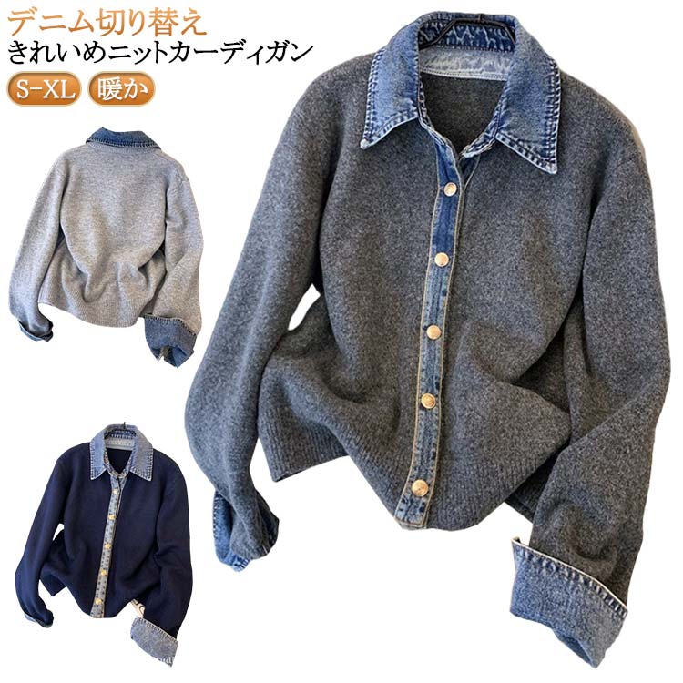 ニット デニム ニットカーディガン 羽織り カーディガン デニム切替 ニットカーデ レディース トップス ジャケット 長袖 前開き 秋 冬 おしゃれ アウター 暖か ドッキン ショート丈