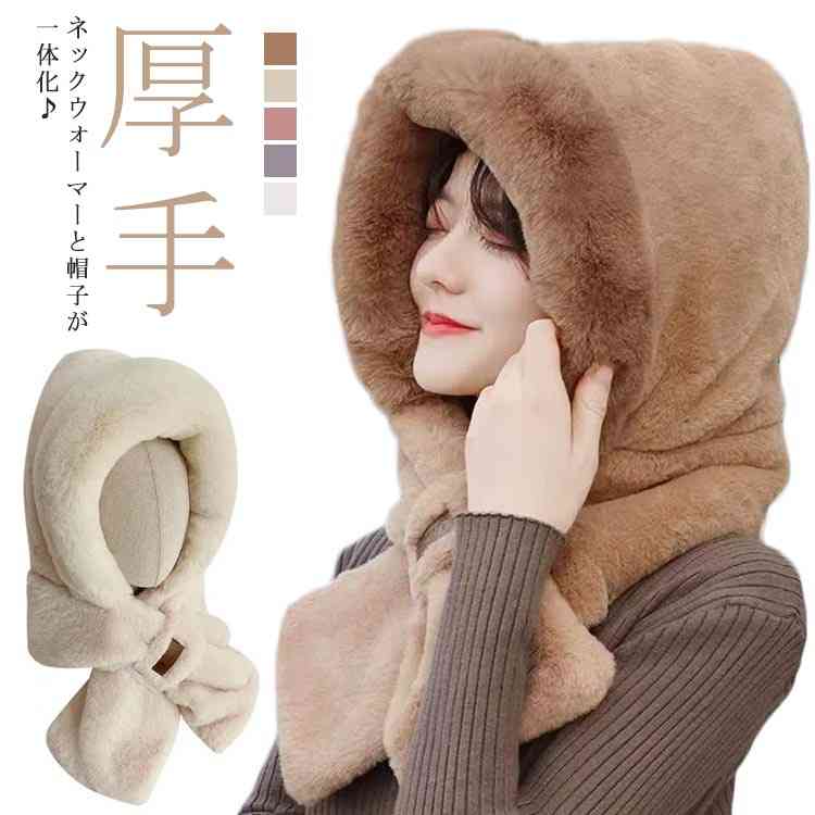 マフラー 帽子 冬 レディース 一体化マフラーフェイクファー ふわふわ 可愛い もこもこ フード付き ネックウォーマー ストール 防寒 厚手 ボア 暖かい小物 秋冬 防寒対策 軽い 静電気 無地