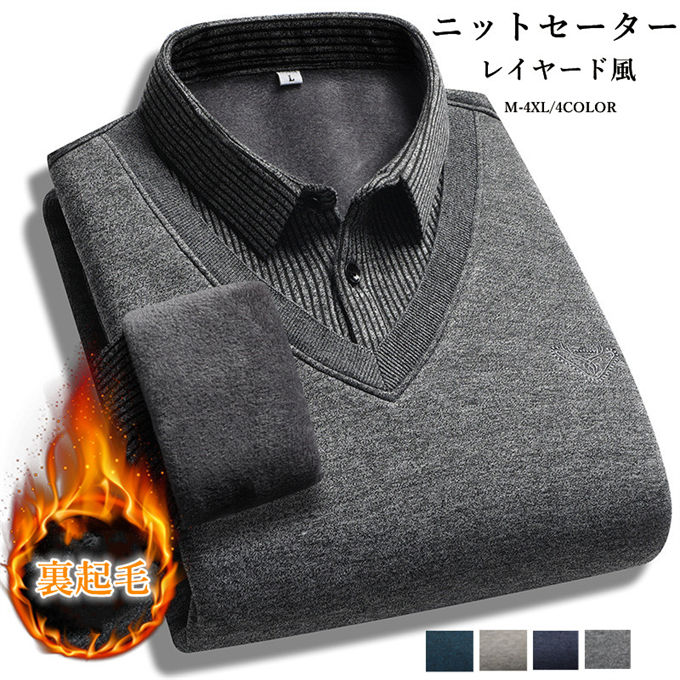 セーター メンズ ニット プルオーバー ニットセーター 折り襟 レイヤード風 裏起毛 シニアファッション 厚手 防寒 暖かい あったか トップス ゆったり カジュアル 冬物 男性 老人 高齢者 紳士