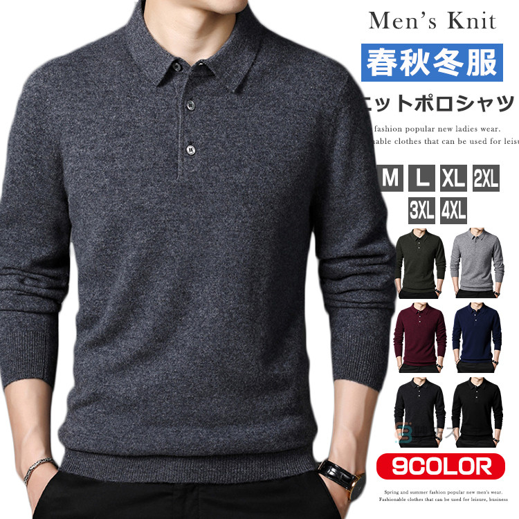 ウール100% ニット ポロシャツ メンズ 長袖 ニットセーター 無地 ニットポロシャツ 男性 トップス ポロ セーター 紳士服 保温 防寒 ゴルフ 通勤 オフィス ニットポロ ゴルフウェア