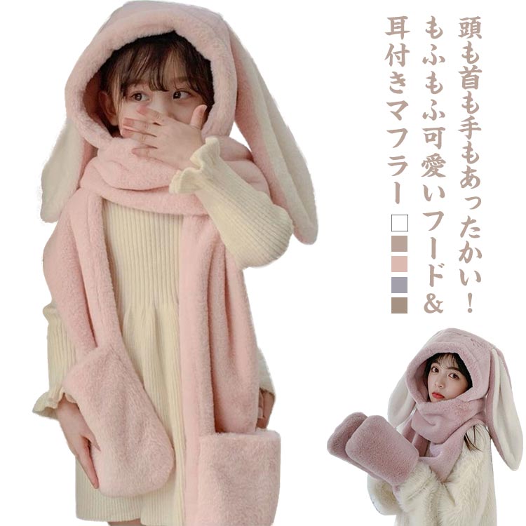 ボア帽子 うさぎ 帽子 耳付き 一体型 マフラーと帽子一体式 うさぎ耳 もこもこ うさぎの耳 レディース ウサギ帽子 ネックウォーマー ふわふわ 被り物 マフラー 手袋 大人 あったか 女の子