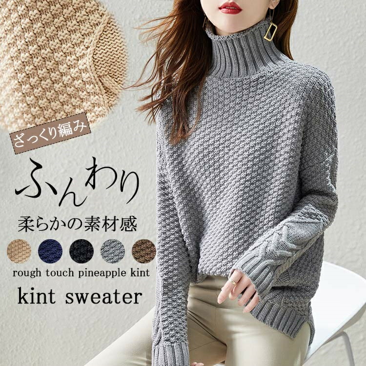 タートルネック ニット レーディス トップス 長袖 ニットセーター カギ編み ハイネック ドロップショルダー ドルマン ローゲージニット リブ チャンキーニット ハイネックニット ざっくり カジュアル