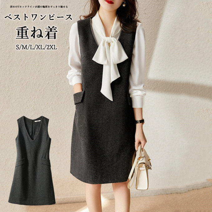 ジャンパースカート 重ね着 大人 深Vネック ワンピース Vベスト 春 秋 冬 無地 膝丈 ミディ丈 ロング丈 フォーマル 体型カバー 着痩せ 通学 通勤 シンプル 冬ワンピ ゆったり レディー ママ