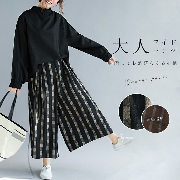 チェック柄 ワイドパンツ レディース 綿麻 大きいサイズ ガウチョパンツ パンツ ボトムス スカチョ ウエストゴム ハイウエスト 着痩せ 体型カバー ゆったり 着こなせ 30代