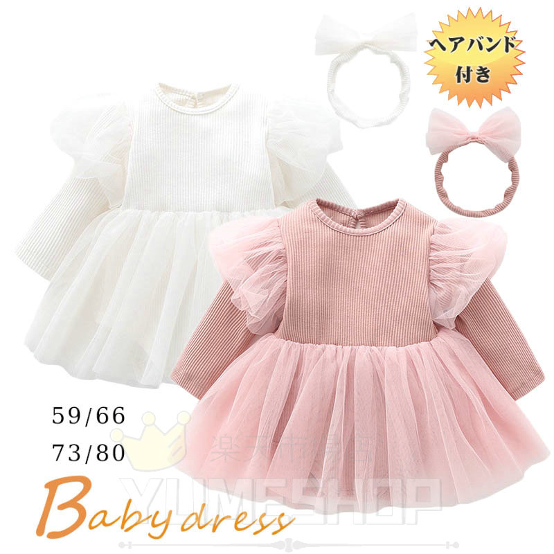 ベビー ワンピース ロンパース 長袖 入園式 ヘアバンド付き ベビー服 ベビードレス 59 66 73 80 90 女の子 秋冬 ドレス 新生児 セレモニード チュール