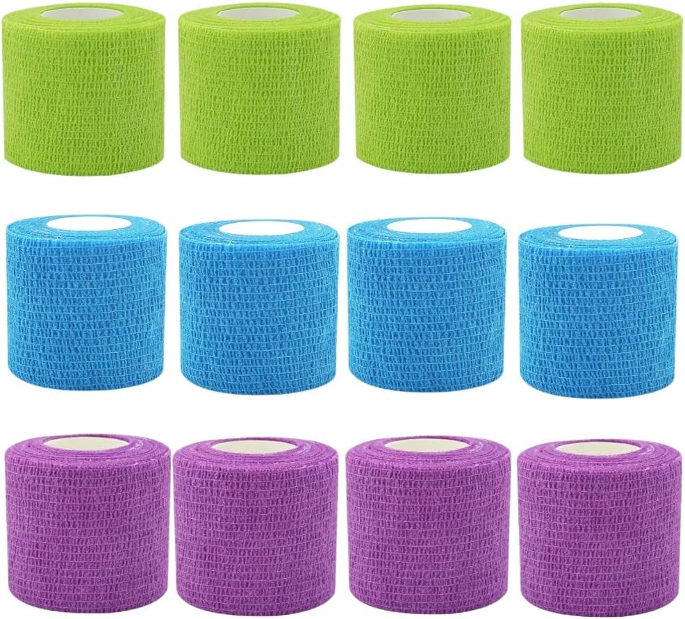 弾性包帯 くっ付く包帯 12個入り 5.0幅 4.5長さ 巻き(伸長時) くっつく包帯 手で切れる テーピング 関節サポート 捻挫予防 多機能 不織布 緑 紫 青
