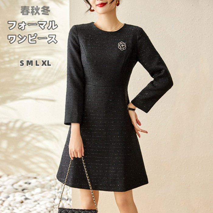 レディース ワンピース セレモニーワンピース ツイード クルーネック 春秋冬 コサージュ付き ショート丈 ウール混 キレイめ エレガント 襟付き 九分袖 フォーマルワンピース 着痩せ お OL