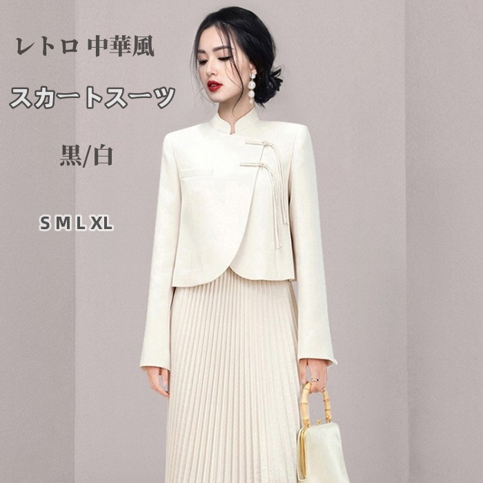 スカートスーツ レディース レトロ 中華風 ジャケット プリーツスカート スーツ ママスーツ セレブ プリーツ ロング丈 スカート 2点セット 春夏秋 長袖 無地 シンプル フォーマル エレ キレイめ