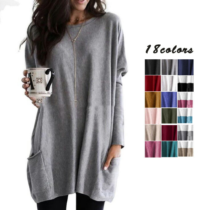 Tシャツ 長袖 トップス ロングTシャツ レディース ポケット付き ロング丈 体型カバー ゆったり 大きいサイズ お洒落 カジュアル 秋服