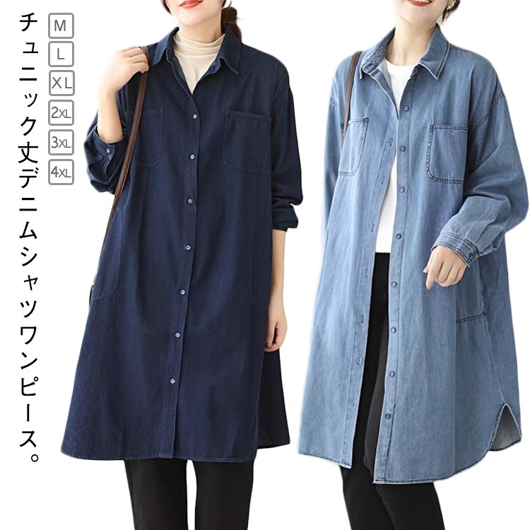 チュニック丈 レディース デニムワンピース ワンピース きれいめ デニムシャツワンピース 長袖 シャツワンピース デニム 襟付き ゆったり 体型カバー 40代 春 冬 30代 5 秋