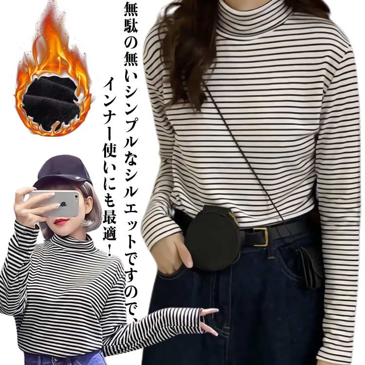 インナー レディース トップス あったかい タイト ハイネック 裏起毛 厚手 シャツ カットソー 長袖 ボーダー 防寒 おしゃれ 大きいサイズ