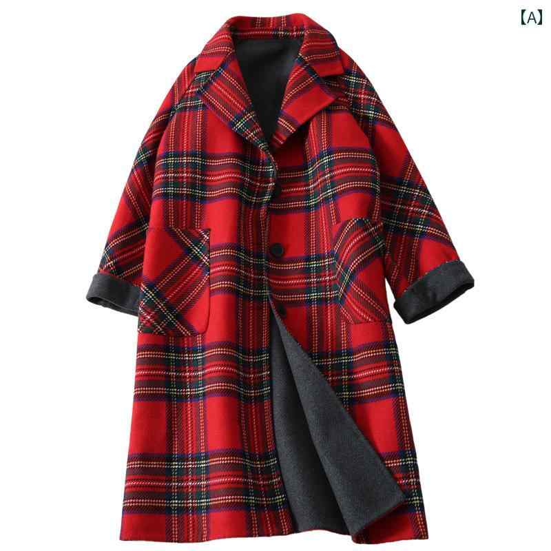 チェック柄ウールコート 女性用 ダブルフェイス カシミアコート、 ミドル 丈、 高級 英国 スタイル、 秋 冬、 厚手の 赤い チェック ウール スーツ ジャケット 柄