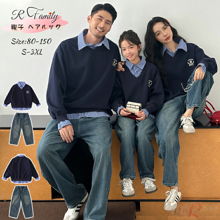 親子ペア トレーナー 長袖 ネイビー 重ね着風 フェイクツーピース デニムパンツ リンクコーデ 親子 セット 秋 冬 紺色 セーター 上下セット 春 お揃い服 子 おそろい 秋冬 親子コーデ
