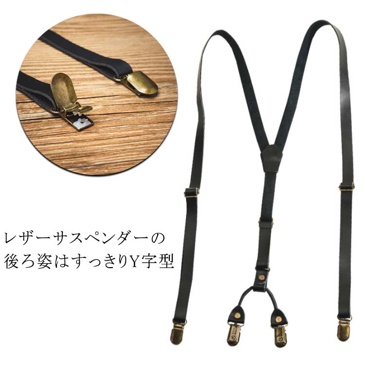 レザー 15mm幅 サスペンダー 革 ズボン吊り スリムサスペンダー メンズ レディース ブラック 黒 クリップ 革サスペンダー 吊りバ 吊りバンド