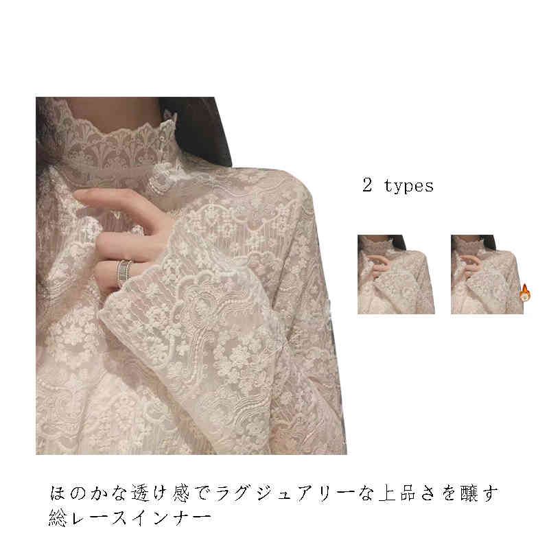 レースインナー 長袖 秋 冬 春 レディース カットソー 裏起毛 夏 インナー トップス ロンT ハイネック 立ち襟 レイヤード 総レース 透け感 細身 下着 パーティー 結婚式 上 重ね着